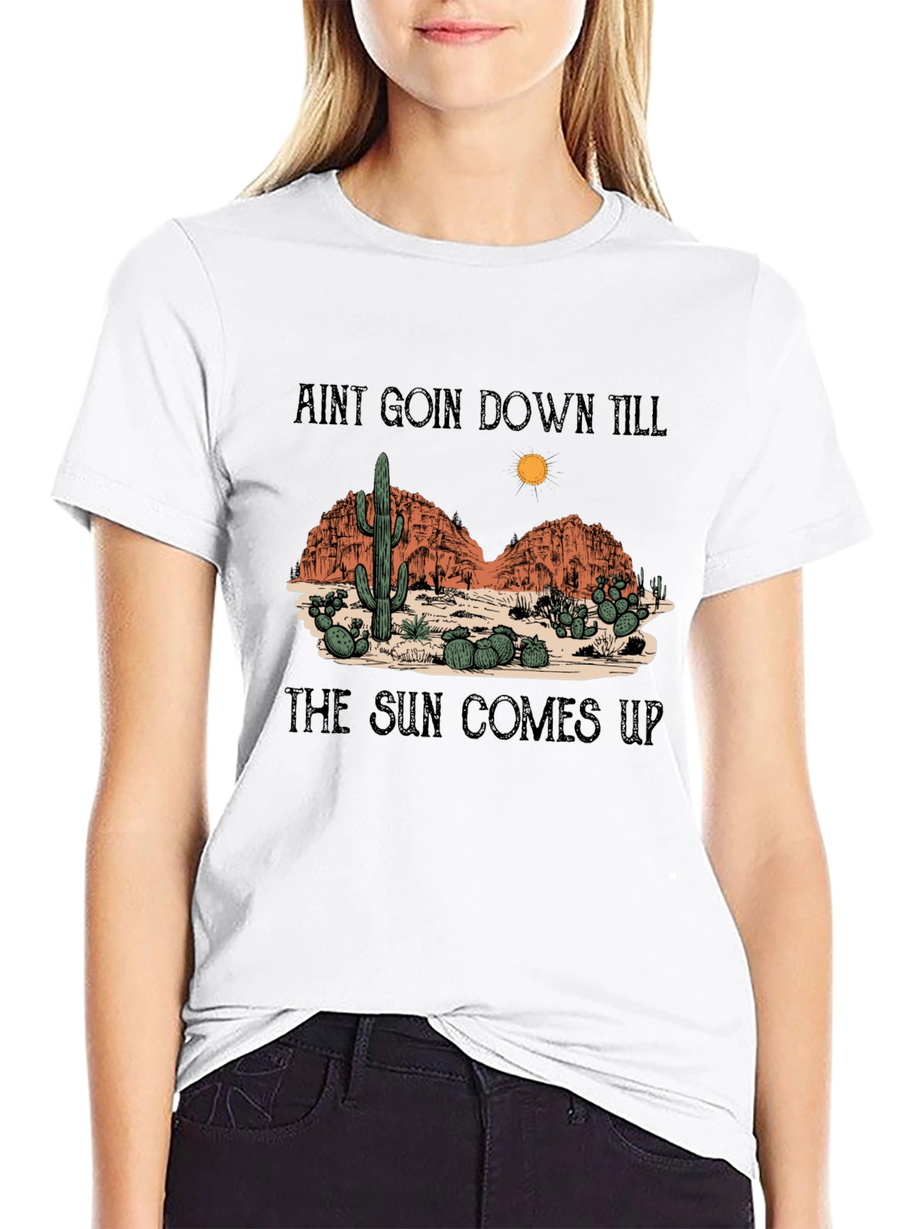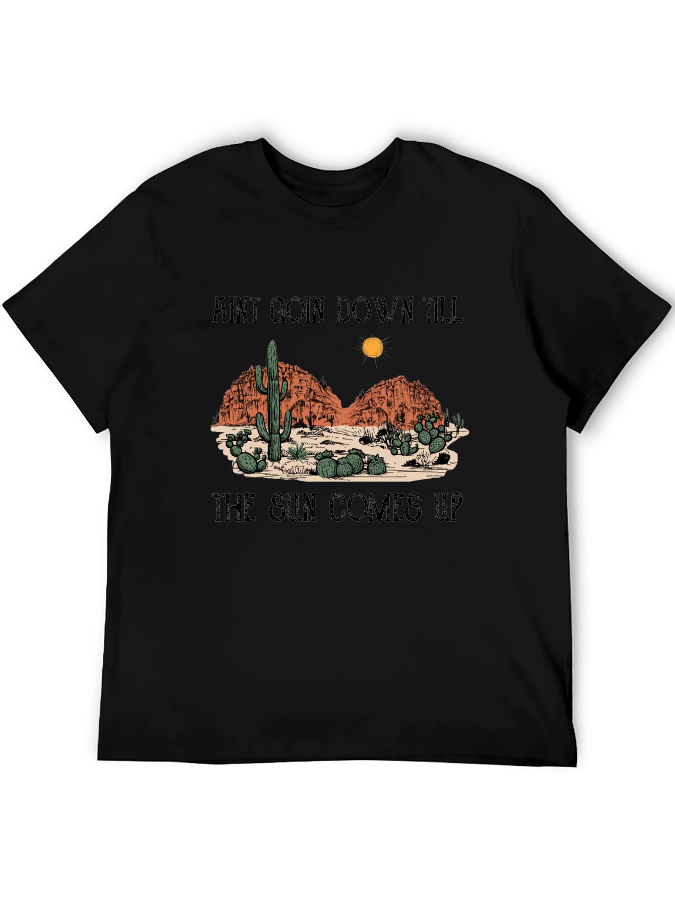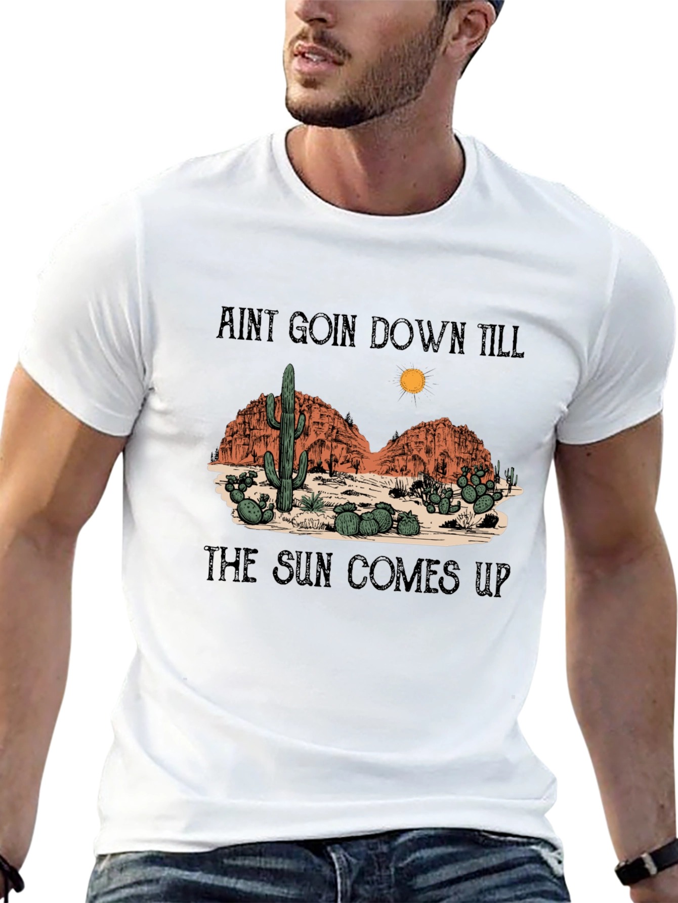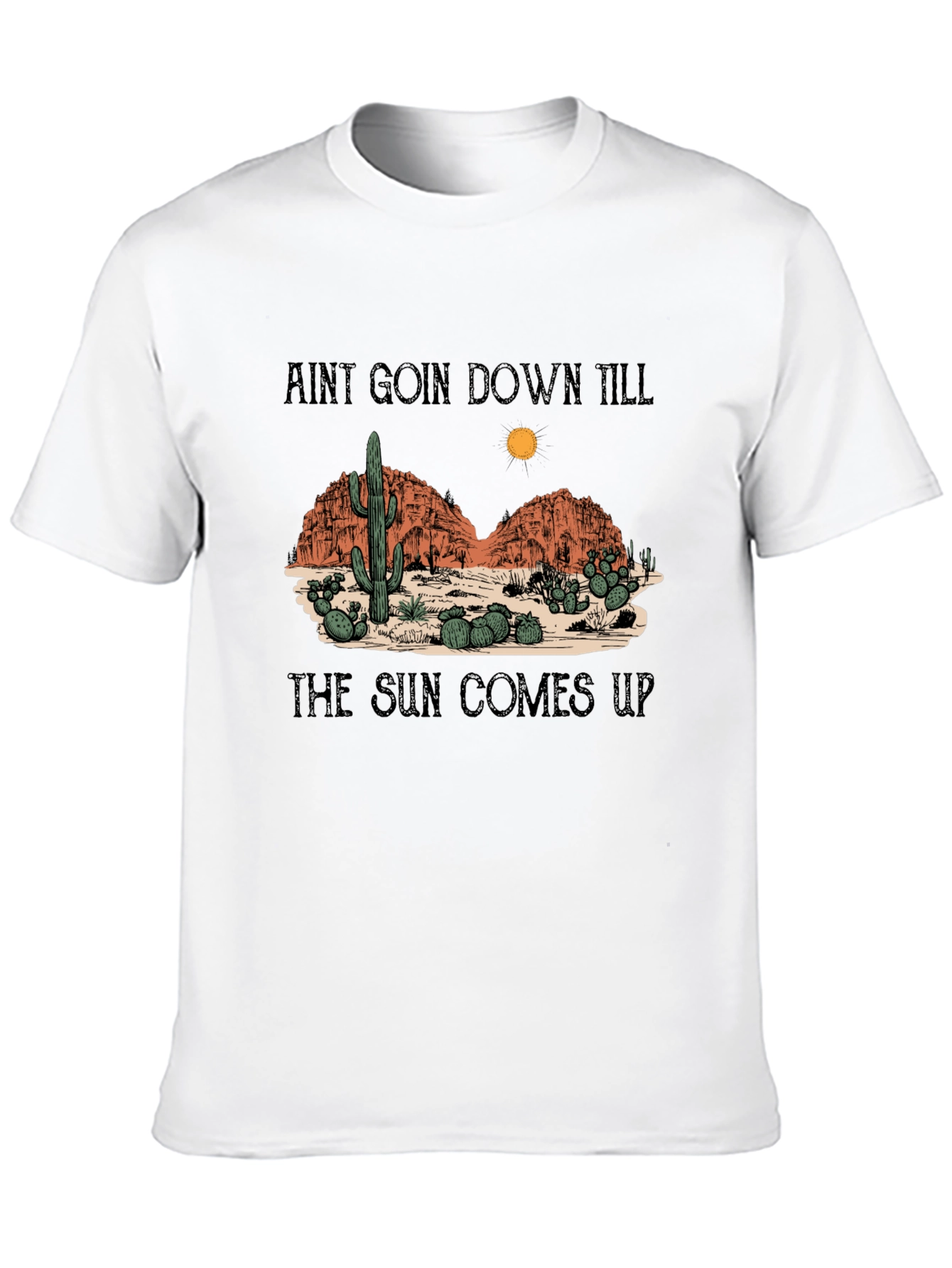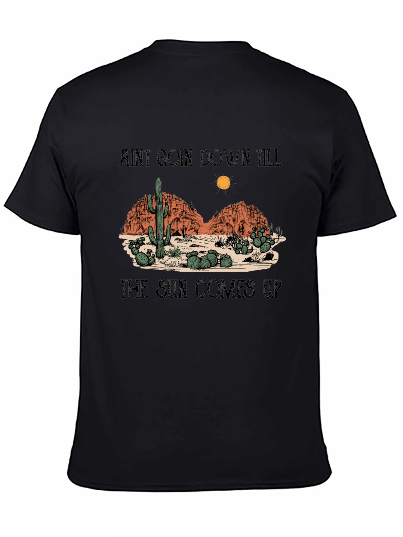 Embrace the night with this bold, black t-shirt. Featuring a desert graphic with cacti and mountains under a setting sun with the words "Aint Goin Down Till The Sun Comes Up", this tee is perfect for those who live for the night. Made from soft, breathable cotton blend, it offers all-day comfort and style. Ideal for casual outings, concerts, or simply lounging around, this shirt is a must-have for anyone who appreciates unique designs and a laid-back vibe. Pair it with jeans or shorts for an effortlessly cool look.