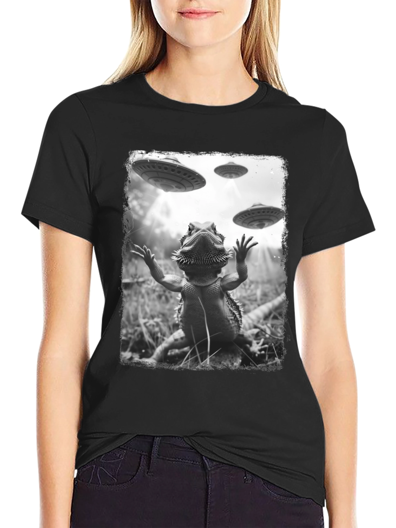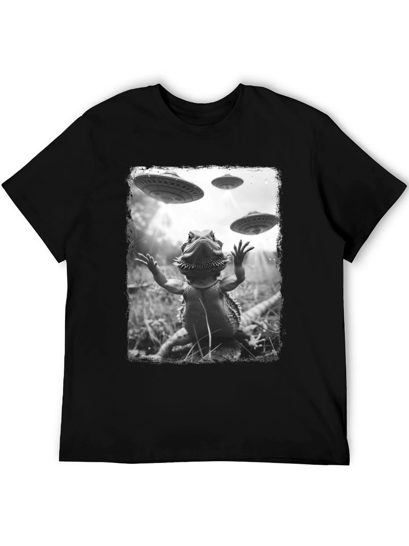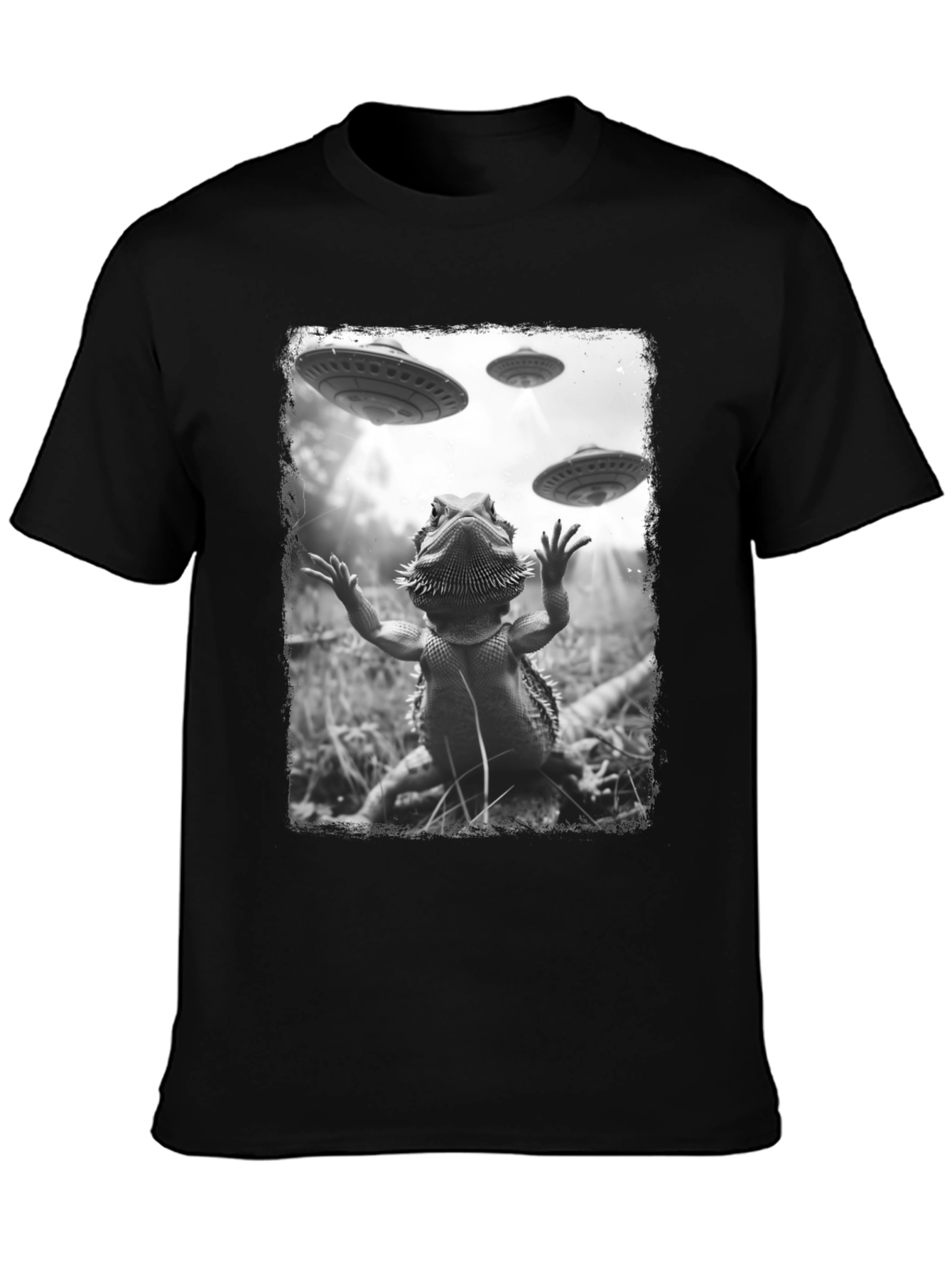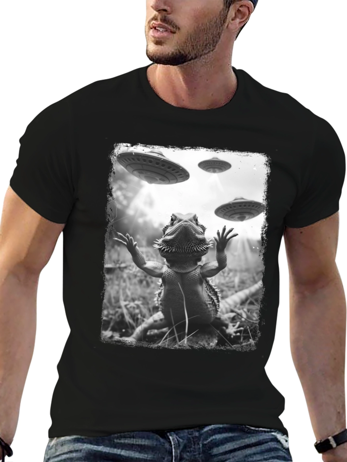 This black t-shirt features a unique graphic print of a bearded dragon appearing to greet three UFOs. The black and white design gives it a modern, edgy look. Made from a soft, comfortable fabric, this shirt is perfect for casual wear. The detailed print makes it a standout piece, ideal for those who love quirky and eye-catching clothing. It's a great conversation starter and perfect for everyday wear or as a fun gift for reptile enthusiasts and sci-fi fans alike.