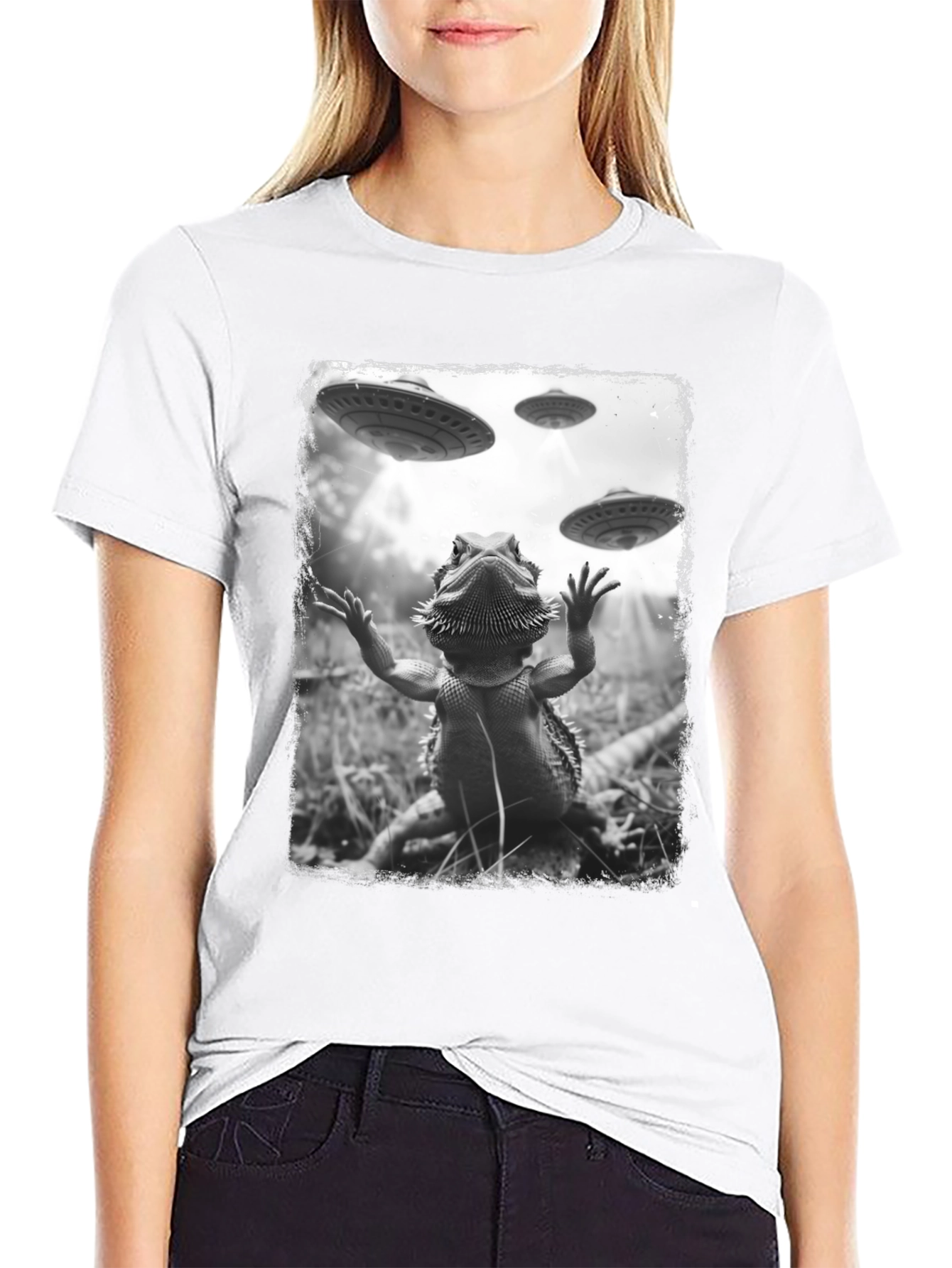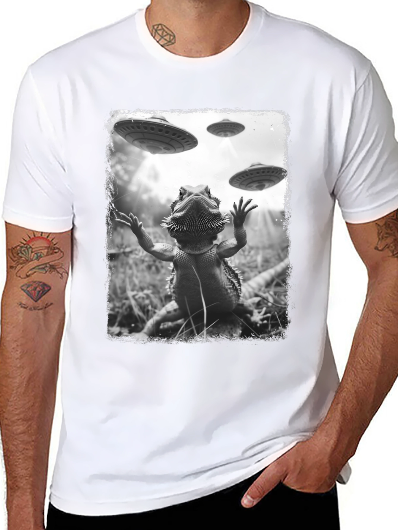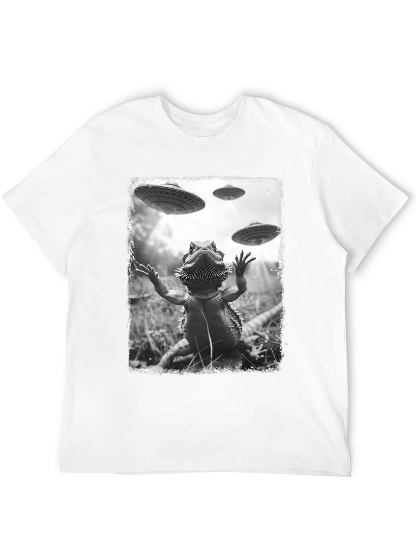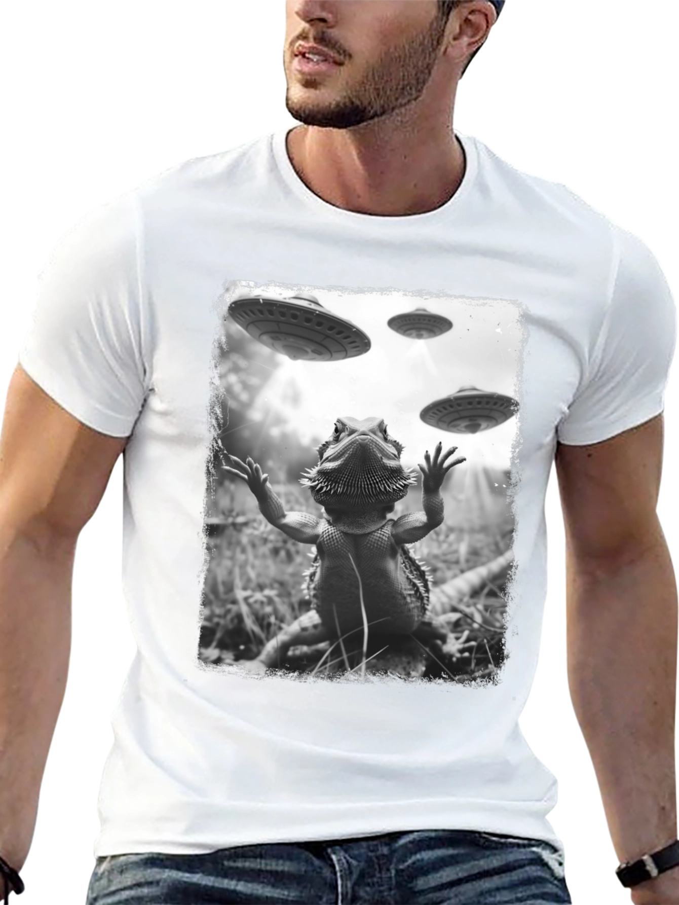 This black t-shirt features a unique graphic print of a bearded dragon appearing to greet three UFOs. The black and white design gives it a modern, edgy look. Made from a soft, comfortable fabric, this shirt is perfect for casual wear. The detailed print makes it a standout piece, ideal for those who love quirky and eye-catching clothing. It's a great conversation starter and perfect for everyday wear or as a fun gift for reptile enthusiasts and sci-fi fans alike.