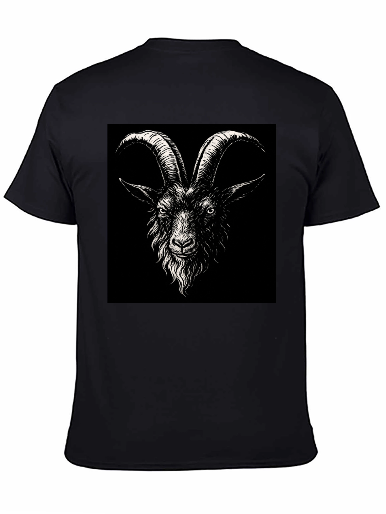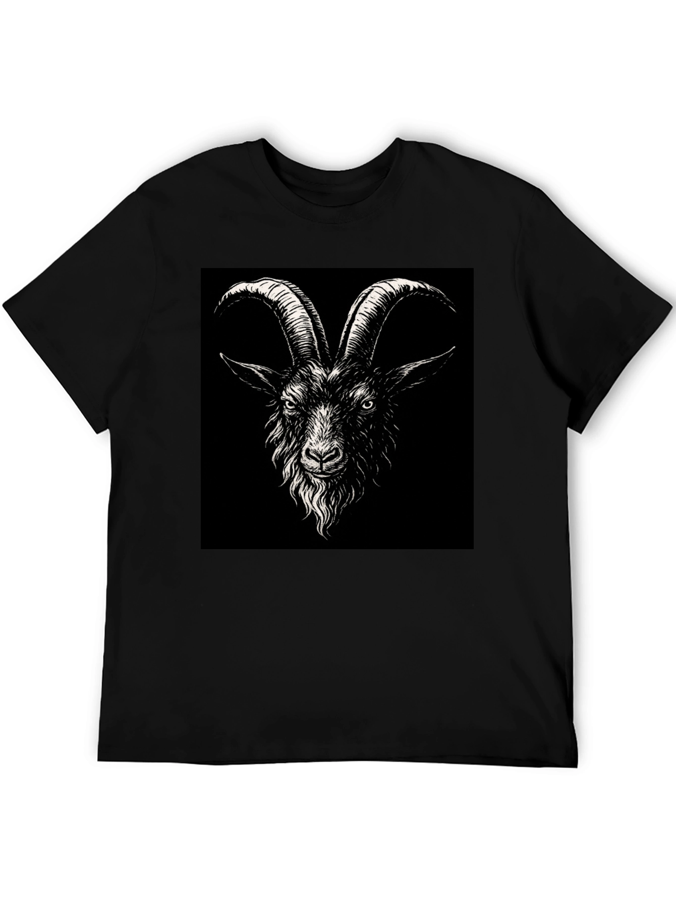 Show off your unique style with this striking black T-shirt featuring a bold goat graphic. The design showcases a detailed goat head with impressive horns against a solid black background. Made from a soft-looking cotton blend, this unisex tee offers both comfort and durability. The classic fit makes it suitable for everyday wear, casual outings, or as a statement piece. Its versatile design pairs well with jeans, shorts, or can be layered under a jacket. This tee is perfect for those who appreciate edgy, artistic designs and want to stand out from the crowd.