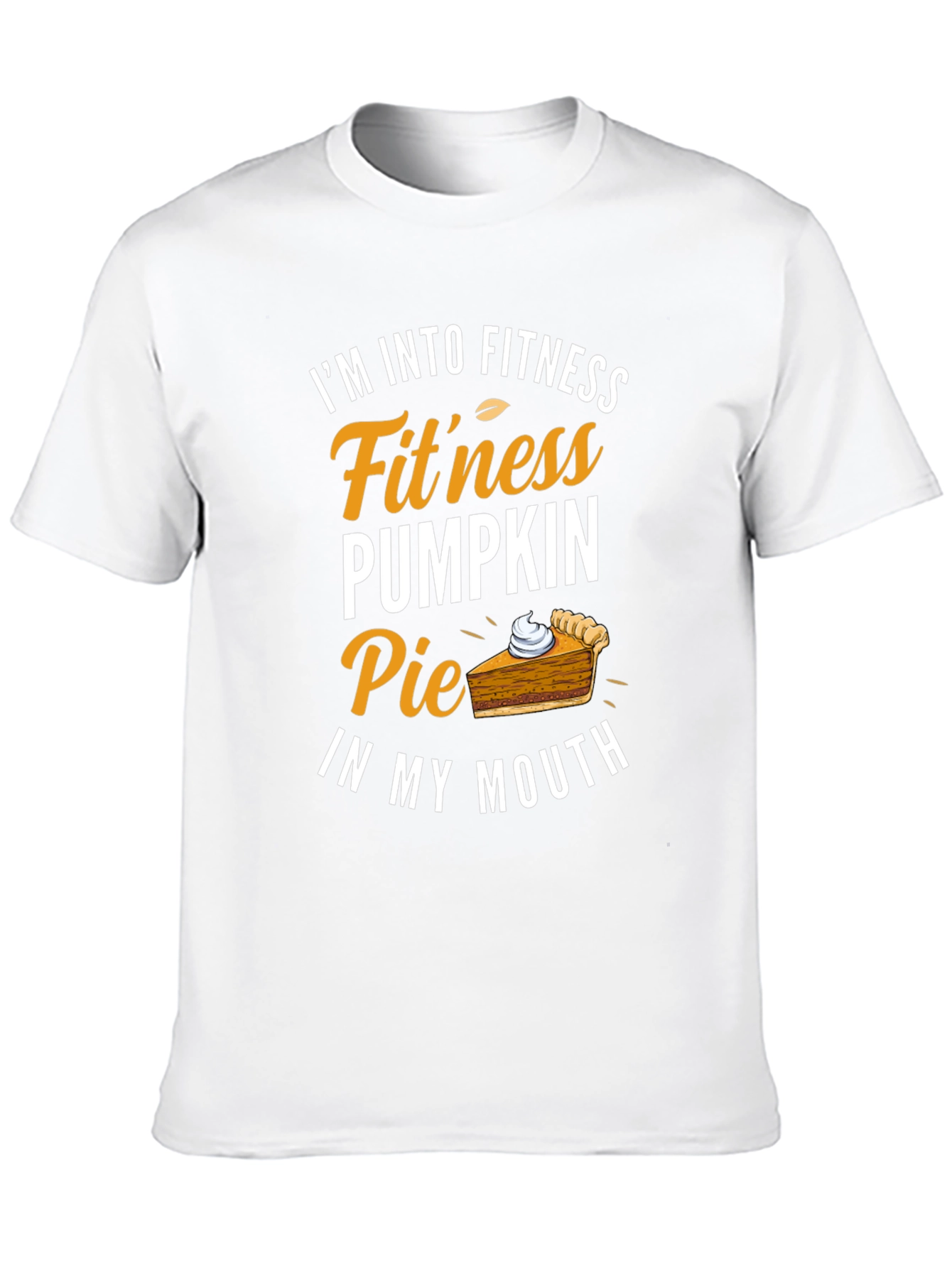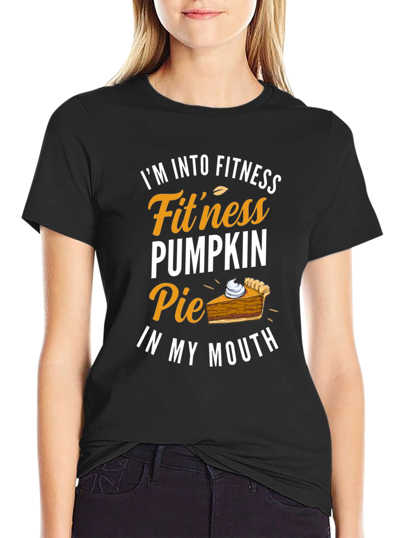 Show off your love for pumpkin pie and fitness with this eye-catching black t-shirt. The design features a slice of pumpkin pie and a clever message about being into 'fitness' pumpkin pie 'in my mouth.' This comfortable tee is perfect for Thanksgiving gatherings, casual outings, or anyone with a sweet tooth and a sense of humor. Made from a soft, breathable fabric, it's sure to become a wardrobe favorite. Makes a great gift for the foodie in your life!