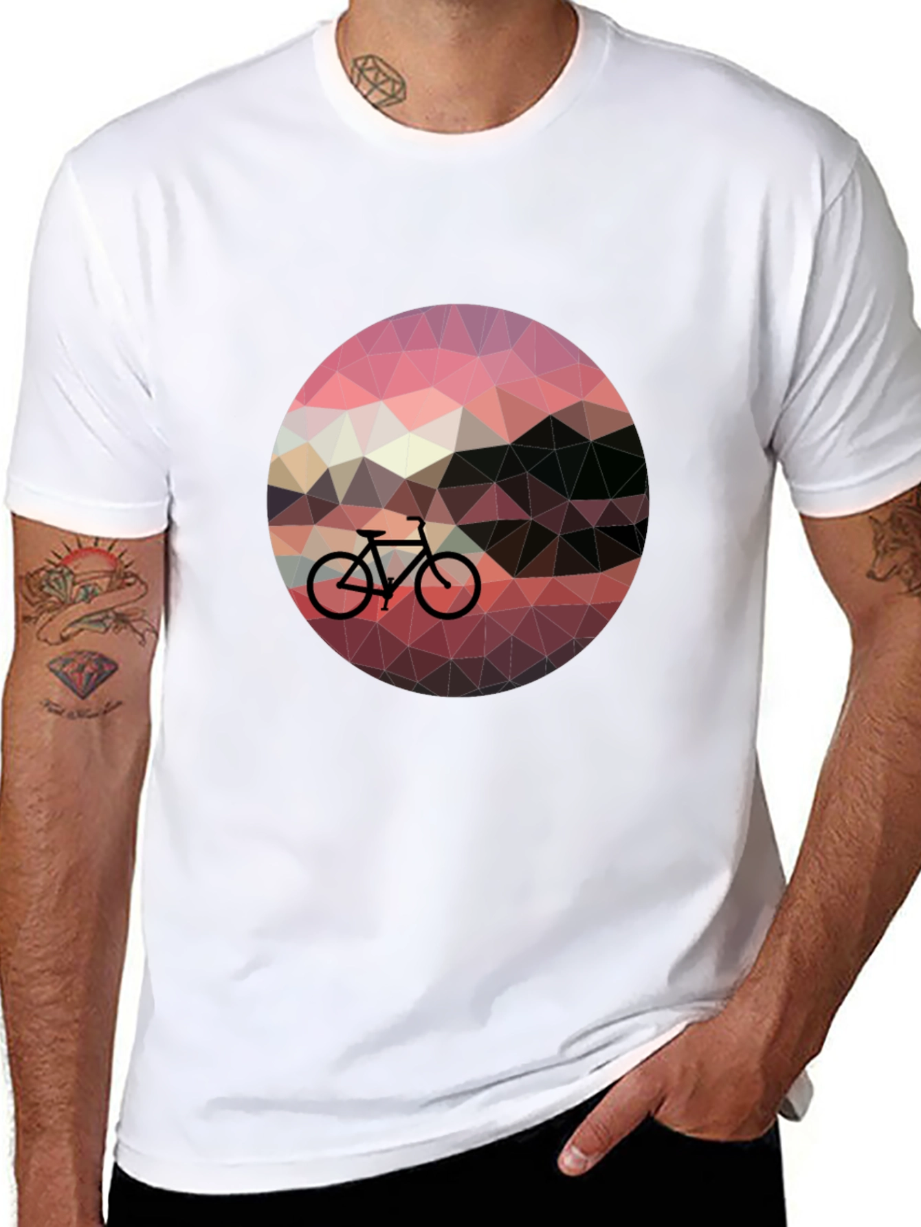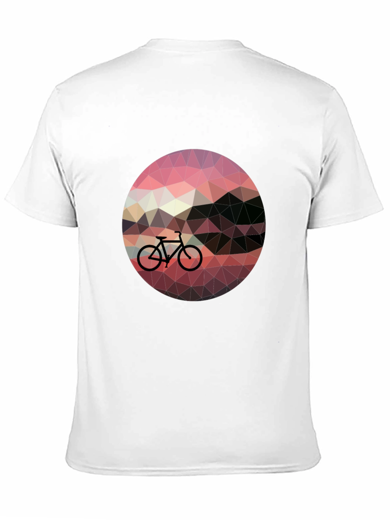 Elevate your casual style with this striking black t-shirt featuring a unique geometric graphic. The circular design showcases a stylized sunset with a bicycle silhouette, blending modern art with outdoor adventure. Crafted from a soft, comfortable fabric, this tee offers a relaxed fit perfect for everyday wear. The bold graphic print adds a touch of personality, making it a versatile piece for pairing with jeans, shorts, or layering under a jacket. Whether you're a cycling enthusiast or simply appreciate eye-catching designs, this t-shirt is a must-have addition to your wardrobe. Show off your unique style and love for the outdoors with this standout graphic tee.