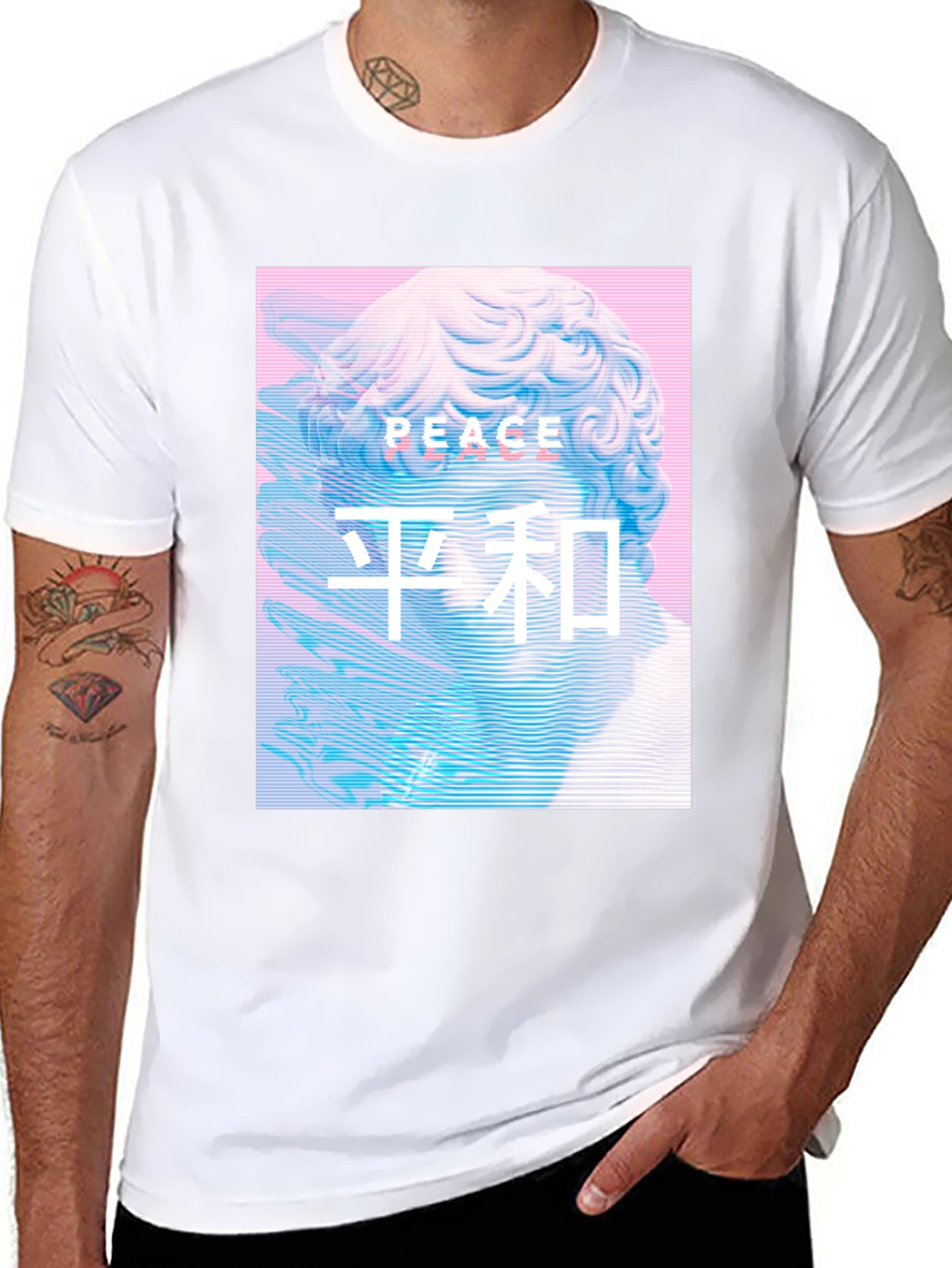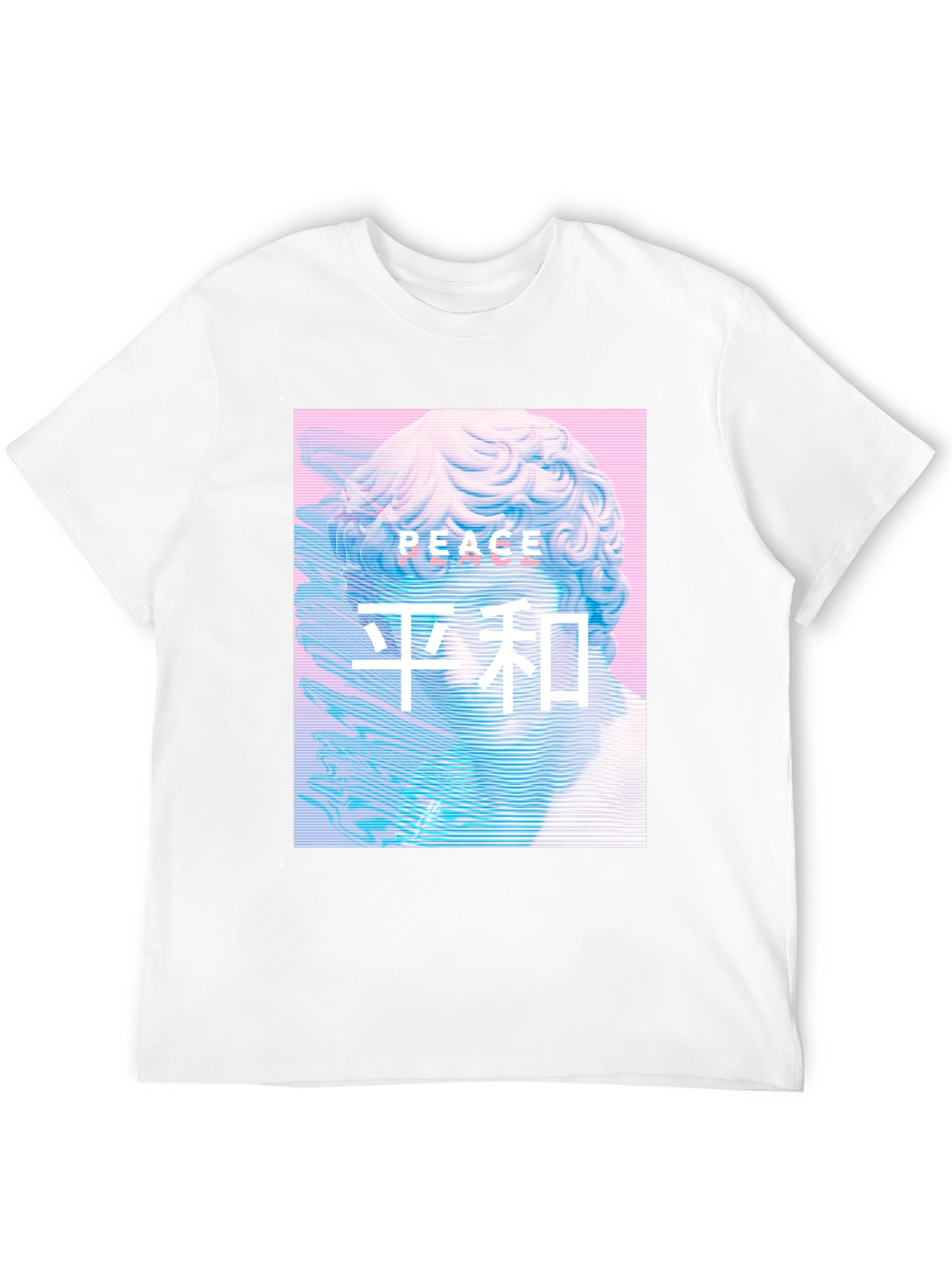 Embrace retro-futuristic style with this unique graphic tee. Featuring a striking vaporwave aesthetic, the shirt showcases a bust statue image blended with vibrant pink and blue hues. The words "PEACE" and a corresponding Asian translation are boldly printed. Crafted from comfortable, breathable fabric, this tee is ideal for everyday wear. Its eye-catching design makes it a standout piece, perfect for casual outings, concerts, or expressing your individuality. Pair it with jeans or shorts for a relaxed yet fashionable look. A statement tee for those who appreciate art and modern design.