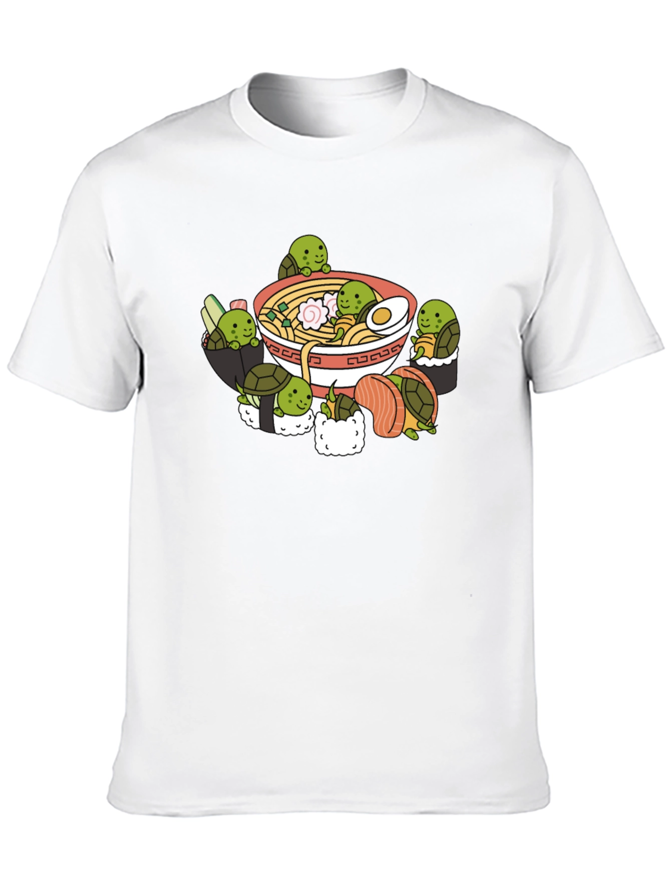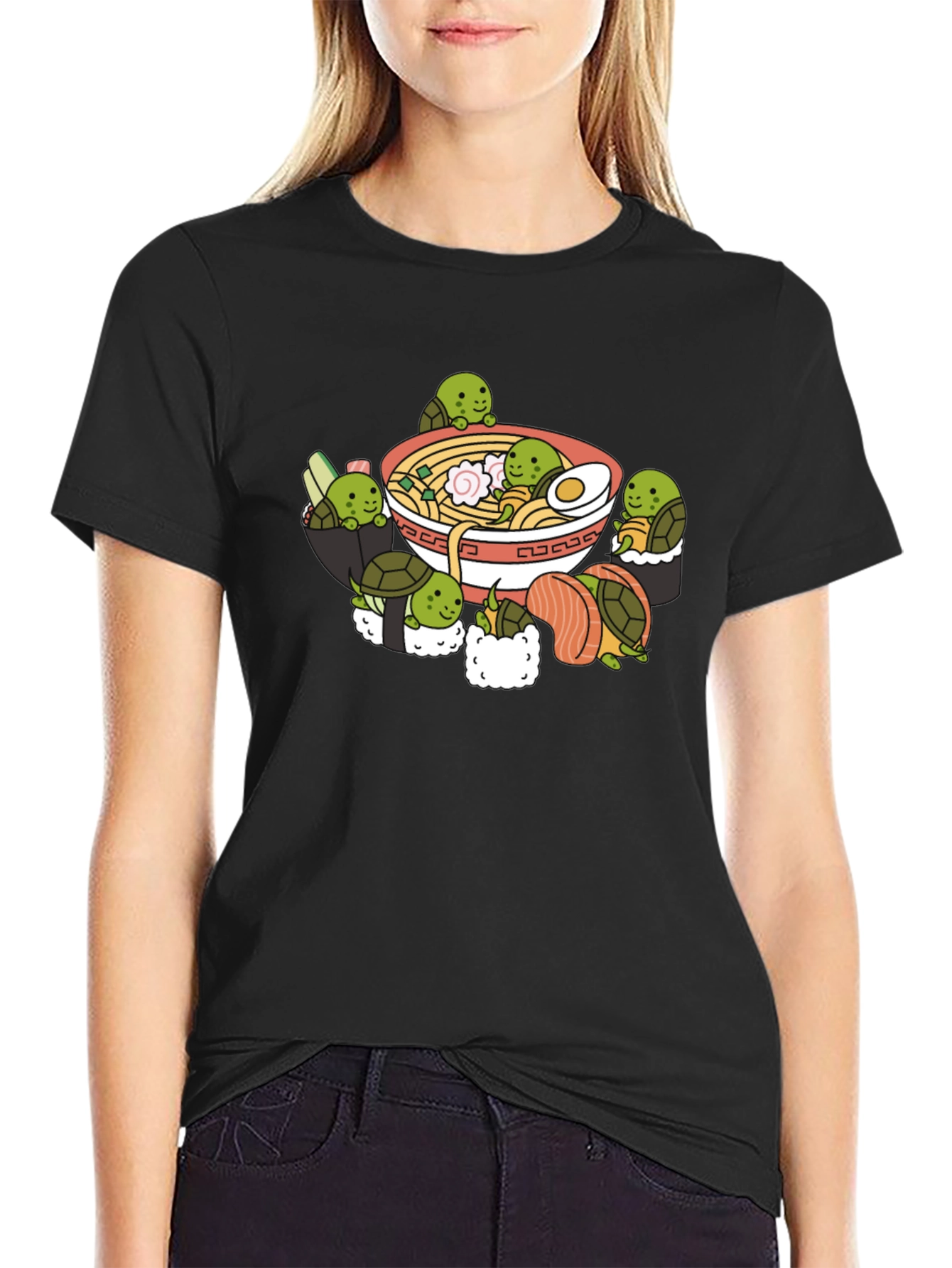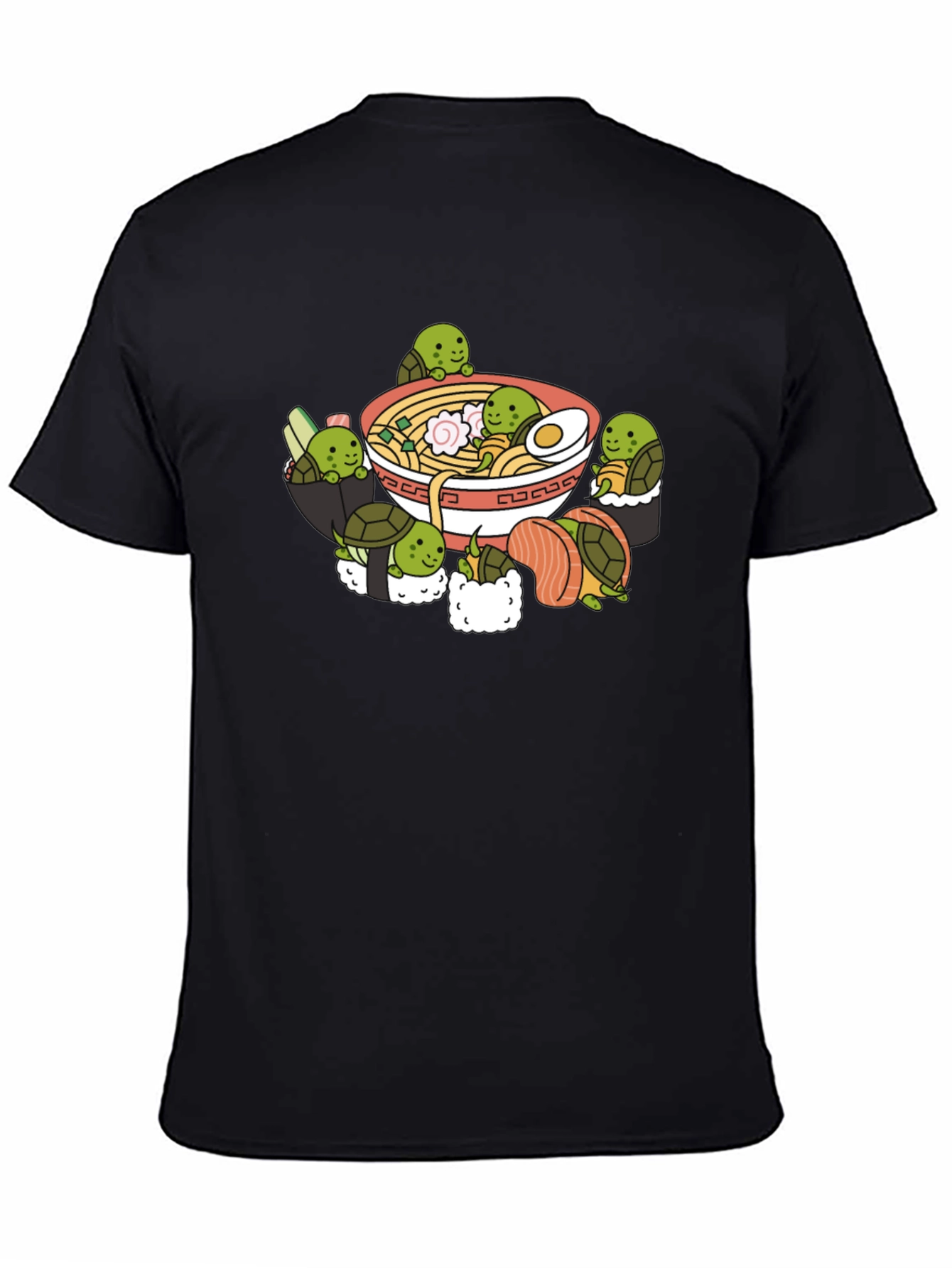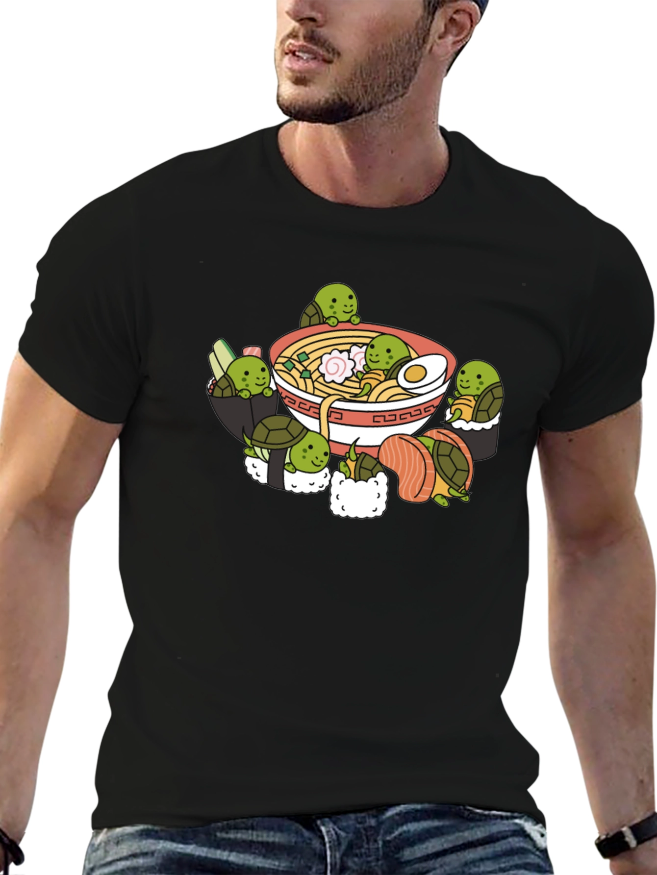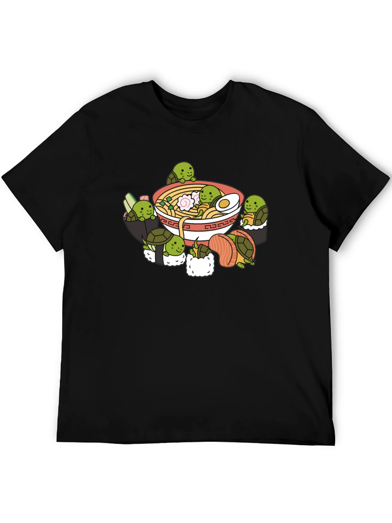 This eye-catching black t-shirt features a playful and unique design. A colorful illustration of happy turtles enjoying a feast of ramen and sushi takes center stage. The design is printed on a comfortable, presumably cotton-blend fabric. This tee is perfect for anyone who loves Japanese cuisine, adorable animals, or simply wants to add a touch of whimsy to their wardrobe. Wear it casually with jeans or dress it up with a jacket – this shirt is sure to spark conversations and bring smiles wherever you go. It is ideal for everyday wear.