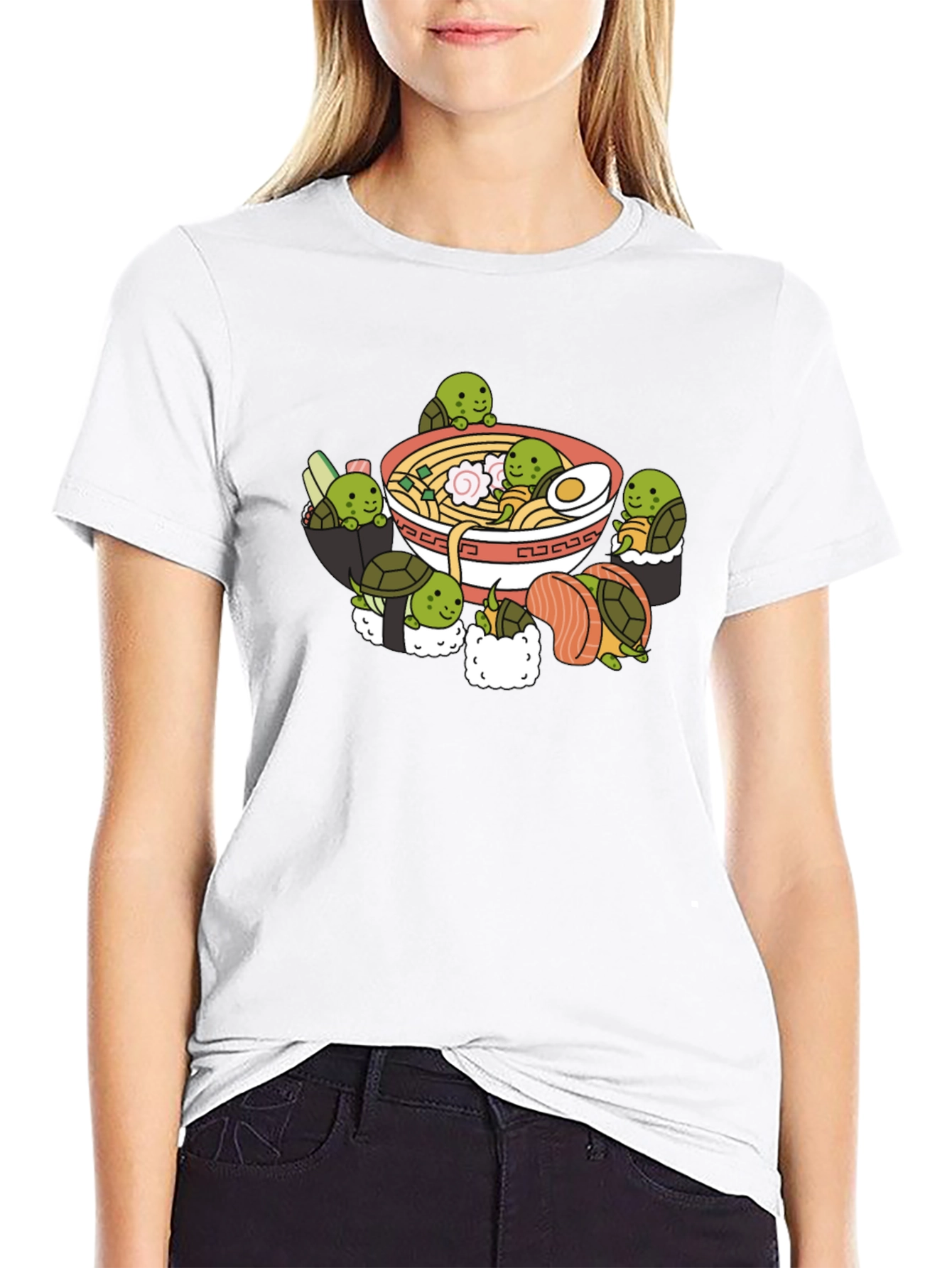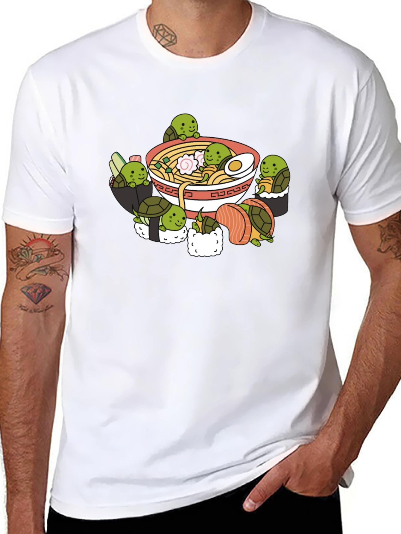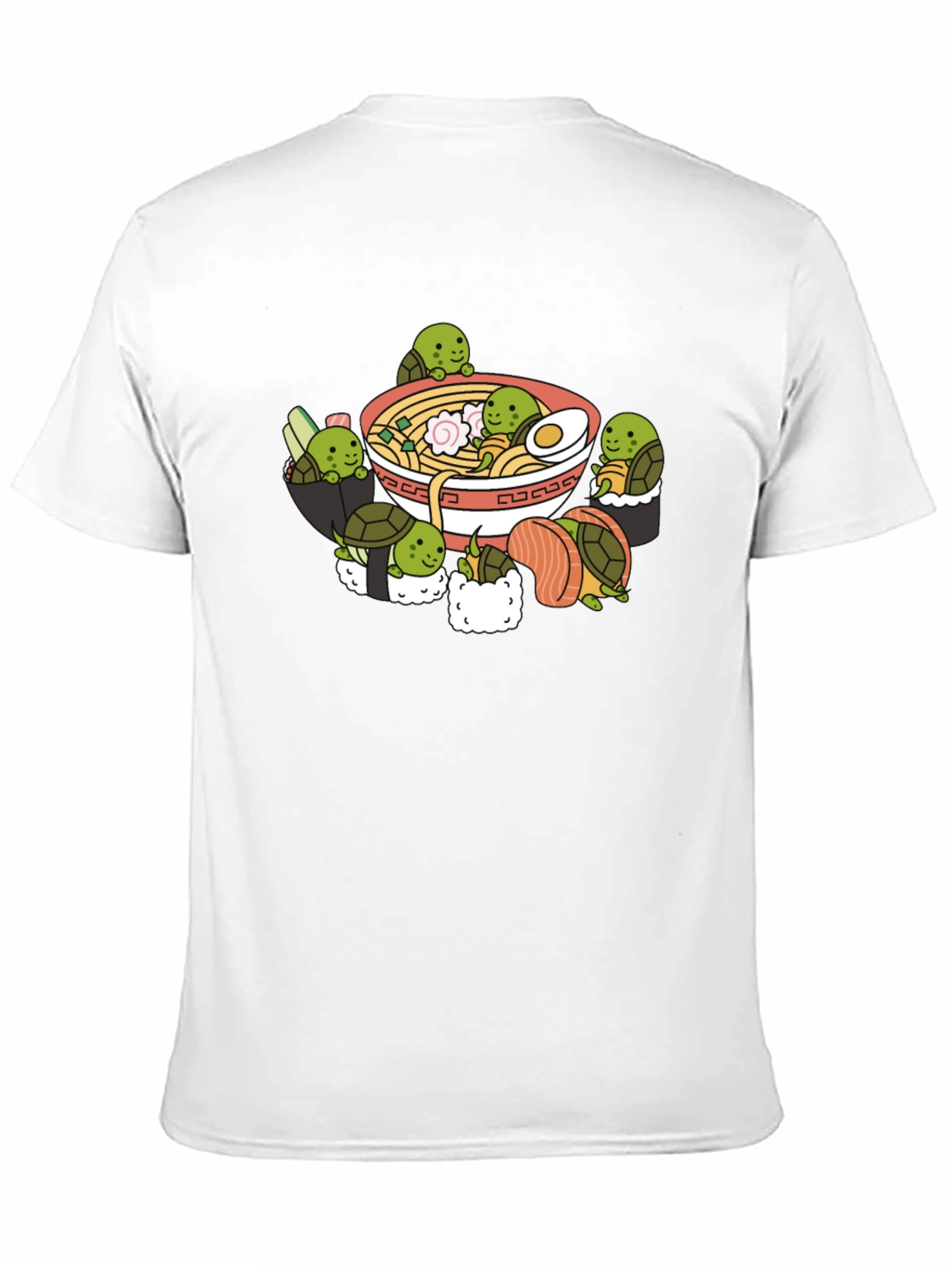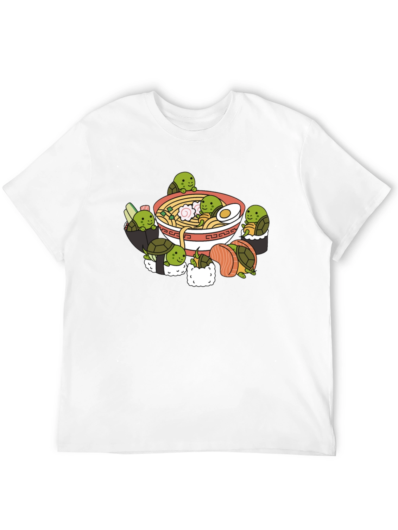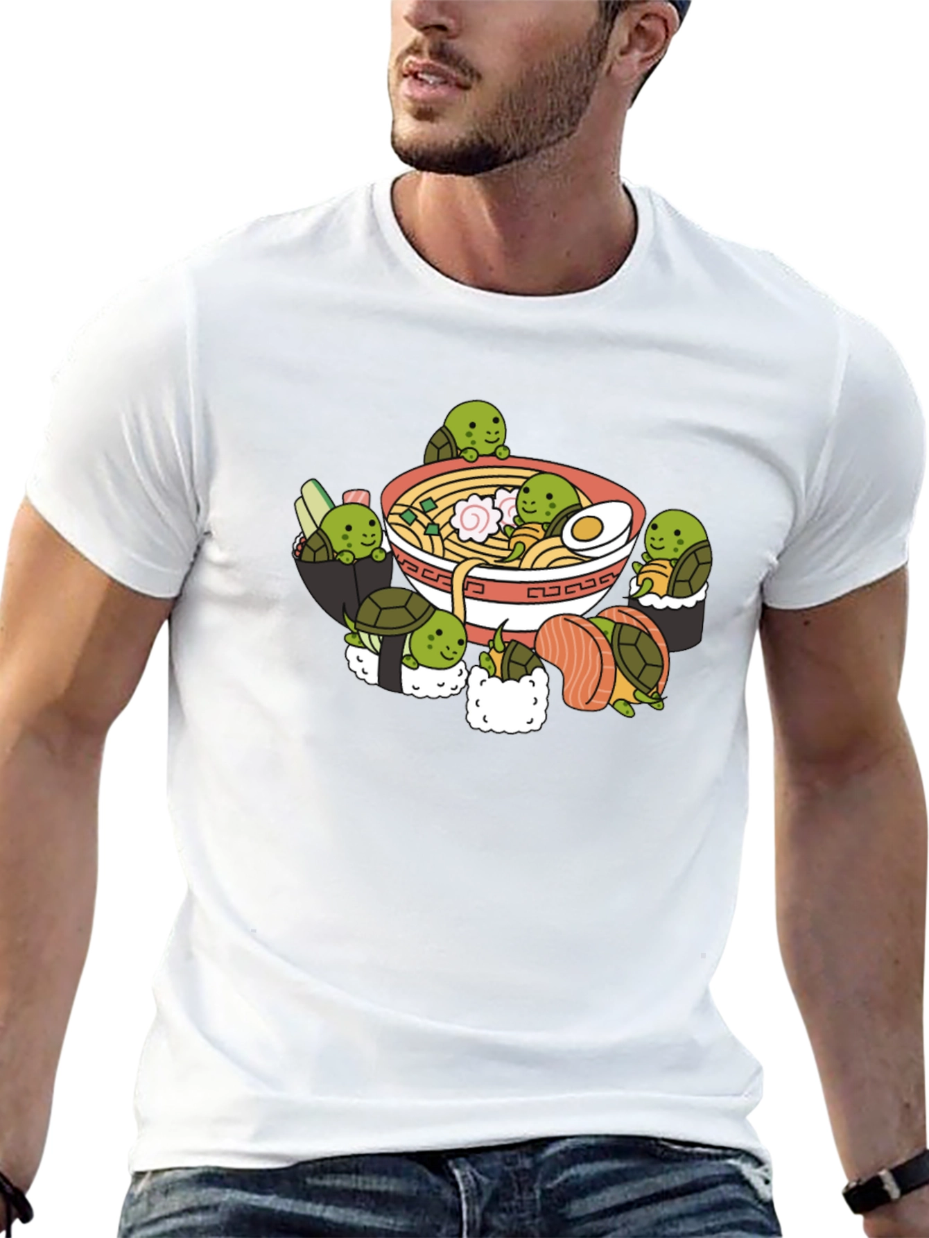 This eye-catching black t-shirt features a playful and unique design. A colorful illustration of happy turtles enjoying a feast of ramen and sushi takes center stage. The design is printed on a comfortable, presumably cotton-blend fabric. This tee is perfect for anyone who loves Japanese cuisine, adorable animals, or simply wants to add a touch of whimsy to their wardrobe. Wear it casually with jeans or dress it up with a jacket – this shirt is sure to spark conversations and bring smiles wherever you go. It is ideal for everyday wear.
