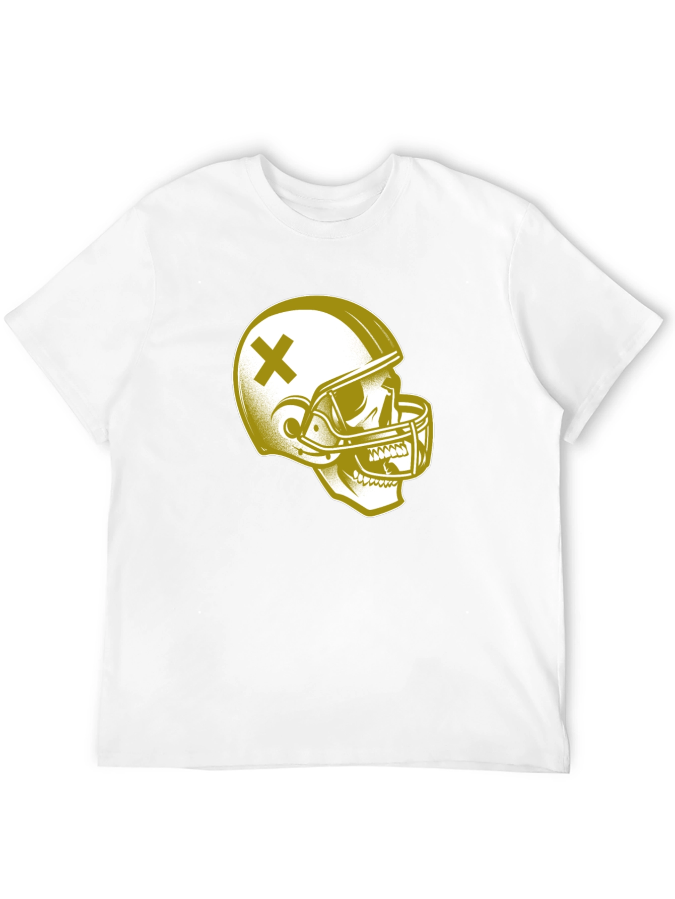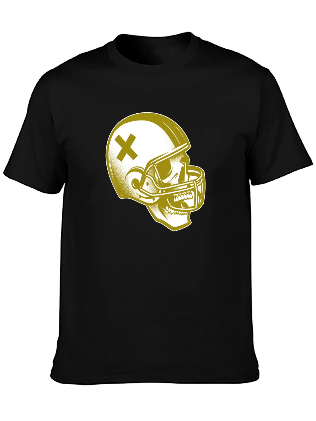 Score a touchdown in style with this edgy black t-shirt featuring a unique graphic design. The shirt showcases a golden skull wearing a football helmet, complete with a face mask and cross detail. This tee combines a rebellious skull motif with a sporty vibe, making it perfect for those who like to stand out from the crowd. Made from comfortable, breathable fabric, it’s ideal for casual wear, game days, or any occasion where you want to express your individual style. Show off your love for football and unique fashion with this striking statement piece.