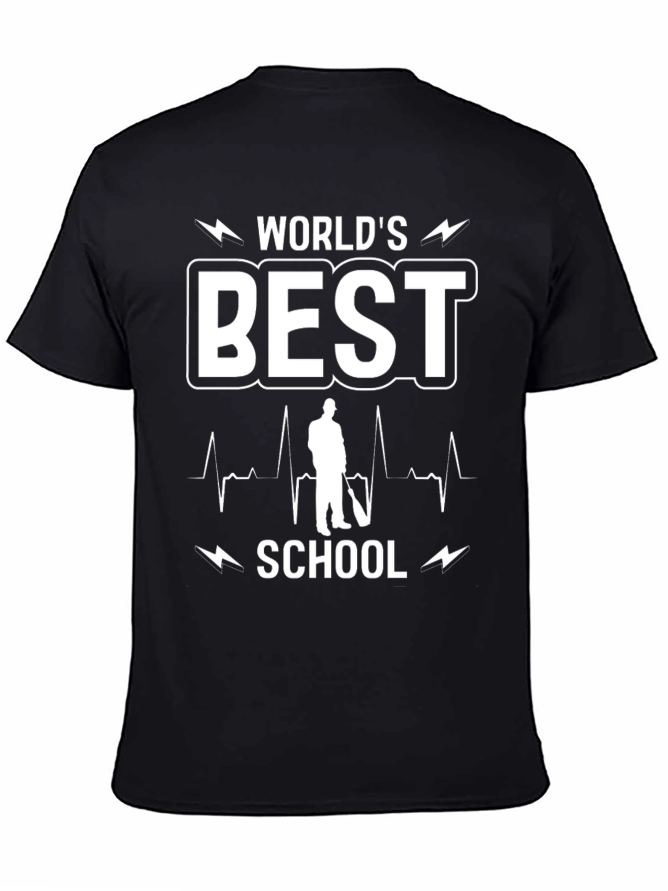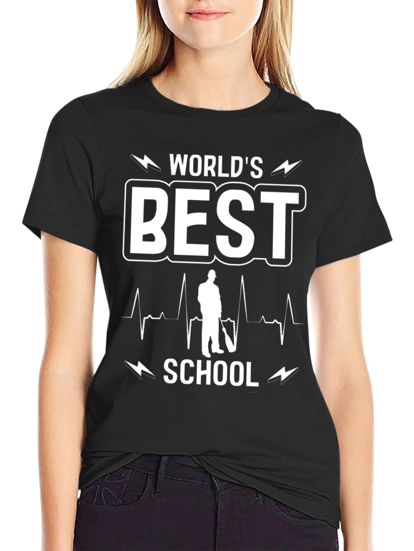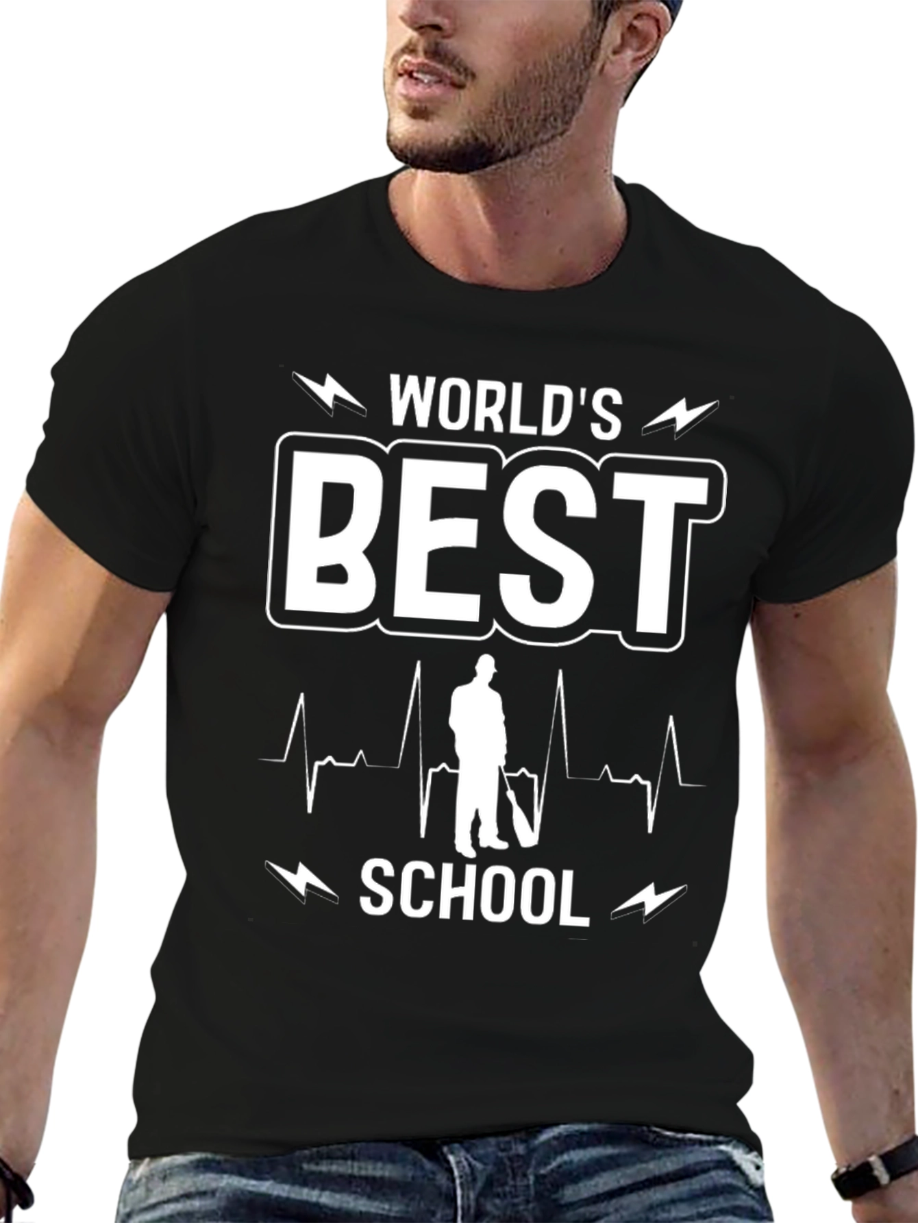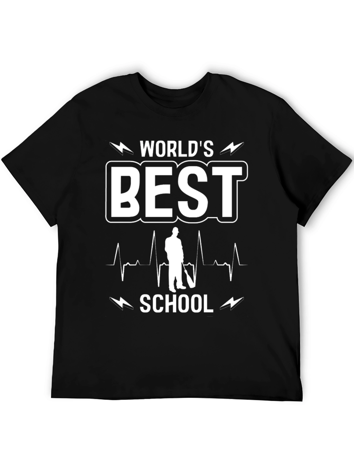 Show your appreciation for the hardworking janitor at your school with this unique t-shirt! The black tee features the bold white text "World's Best School", with a silhouette of a janitor in the center. Accented with lightning bolt graphics, this design is sure to make a statement. This tee is perfect for casual wear, school events, or as a thoughtful gift to honor the school janitor's dedication and hard work. A comfortable and stylish way to show some love!